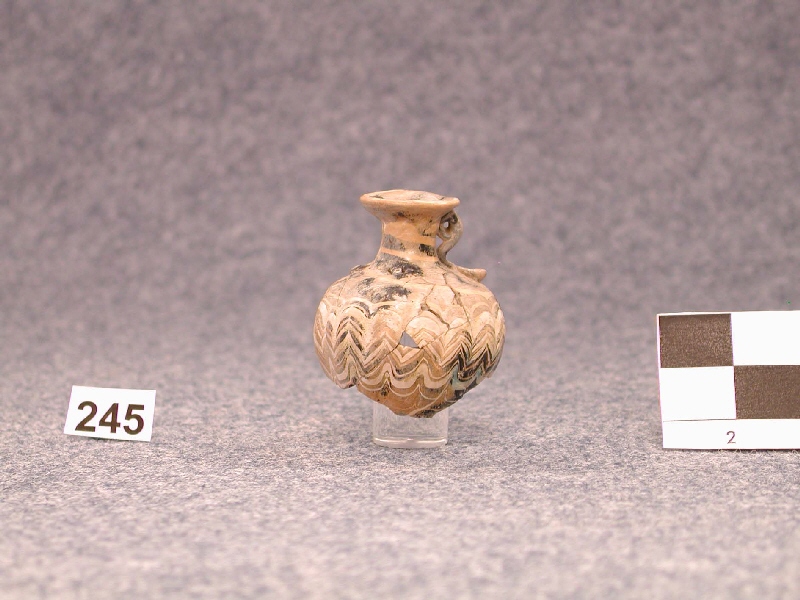 Aryballos de vidrio, roto, le falta el extremo inferior. Su manufactura es egipcia y es bastante frecuente encontrarlos en ajuares griegos de los siglos VI-IV a. C.