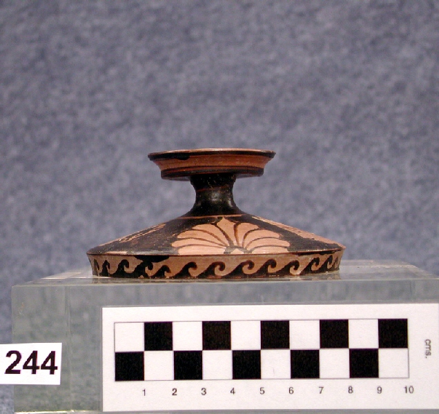 En el anillo exterior presenta una cenefa de postas. En la pared, palmetas y cabezas femeninas enfrentadas a dos, de similares características. Llevan un pañuelo abierto en la nuca y sujetado con cinta blanca, en la frente van ataviadas con una diadema amarilla con festón blanco y llevan pendientes amarillos con apéndice cónico y un collar de cuentas amarillas. Las palmetas tienen nueve hojas, el asa es circular, ligeramente rehundida y borde saliente, con un reservado central. El interior presenta dos reservados circulares.