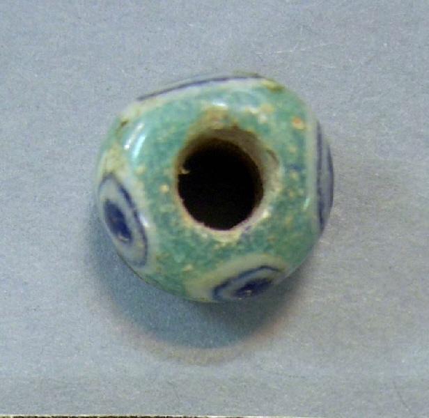 Cuenta de collar fabricada en pasta vítrea de forma más o menos circular, con sección ovalada y con una perforación central longitudinal para ser insertada. La pasta es de tonalidad verdosa y tiene una decoración consistente en cuatro ocelos pareados de tonalidad azul rodeando la pieza.